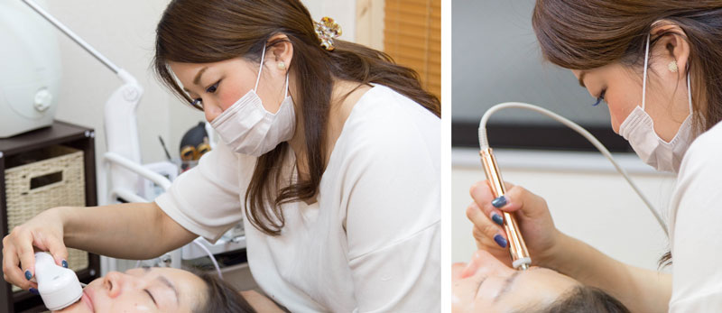 クレンジングメニューでは、専用の器具で古い角質や毛穴の汚れを取り除き、美顔メニューではヒアルロン酸やコラーゲンを肌の奥深くまで行き渡らせてお肌をケアします。