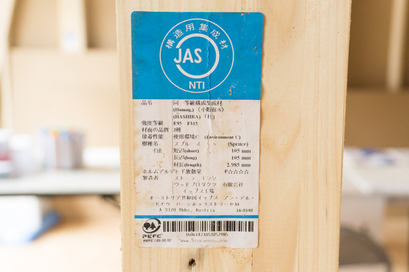 これは、生の木を1本そのまま使ってるんではなくて、薄い木材を専用のボンドで貼り合わせたものなんです。幅は105mm。強度を出すためには、1本の木よりも集成材の方が丈夫なんです。