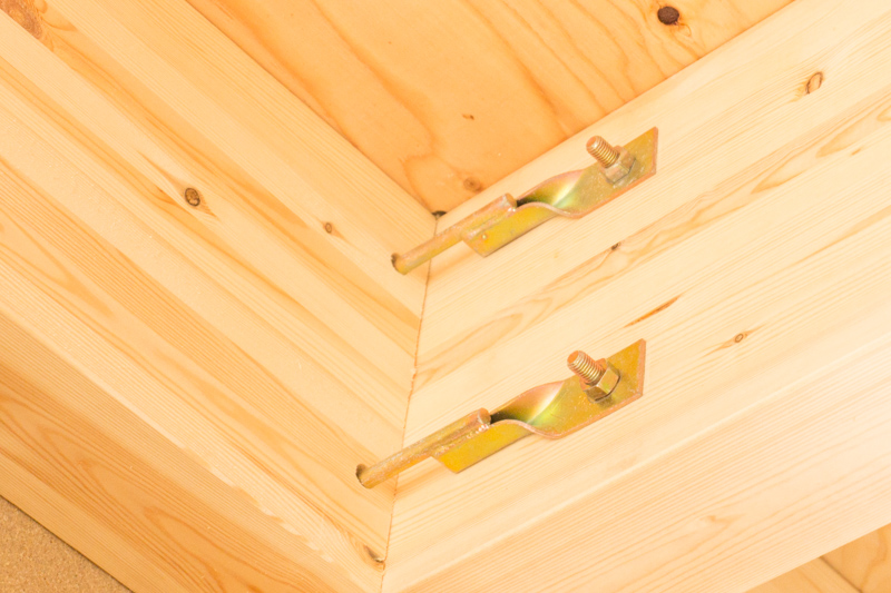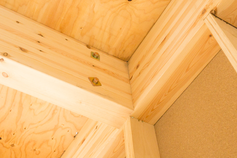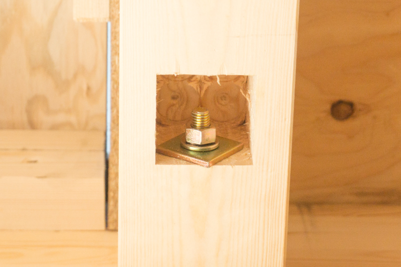 いや、よく見るとわかると思うけど、それぞれの木材をねじでそれぞれ5本ずつとめてるのでかなりがっしりくっついています。だから、大丈夫です!↓ 他にも様々な"金物"が家を支えています。
