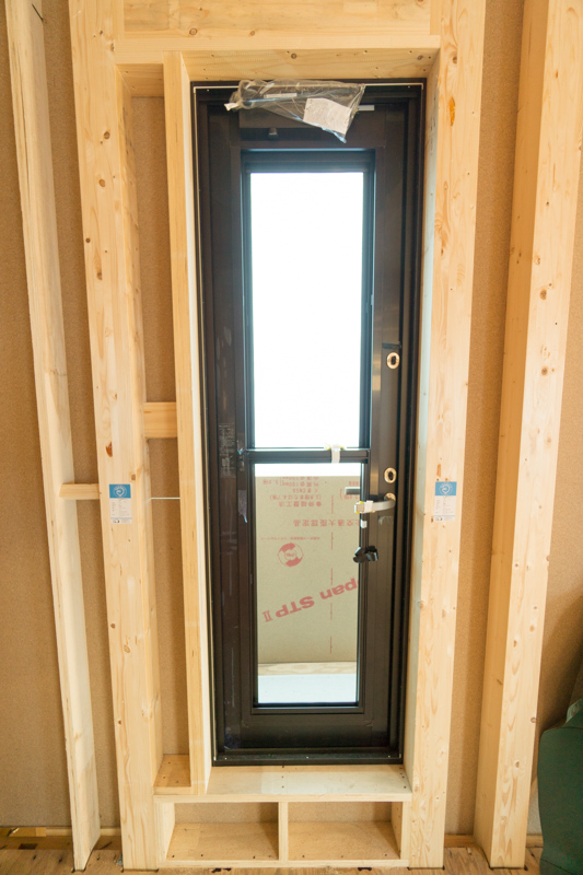 そうですよ。施主さんのご要望でワンサイズ大きい窓を作ることになったので、特注の窓枠です!下の横長の穴は大きな採光窓。南側なのでちょっとでも部屋を明るくするためです。