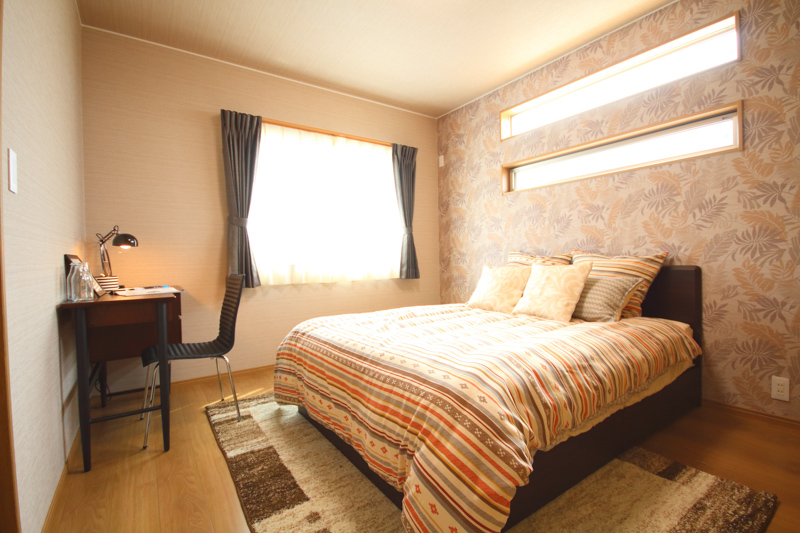 そして、寝室はシックな雰囲気(7帖)!オシャレな壁紙と、2本ラインの細い窓が粋です