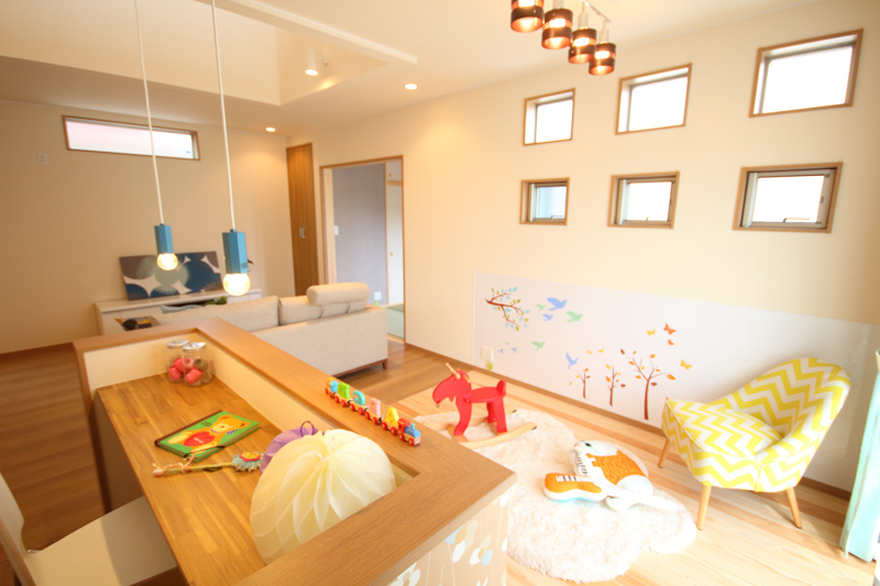 仕事・縫い物・読書・アイロンがけ…などなど、あらゆることに使えそうなステキなカウンターと、その先には、目が届く場所で子どもを遊ばせられるキッズスペース