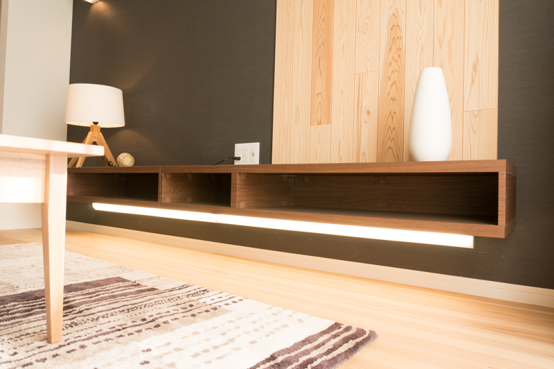 おさやが気になったのはこの棚。下から間接照明がついていて、いい雰囲気をつくり出しています。