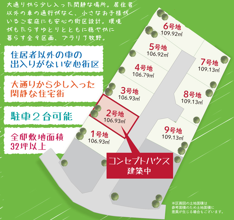 プラリア牧野は全部で9区画の街区ですが、まだ新しすぎてほとんど更地の状態。コンセプトハウスも建設中です!