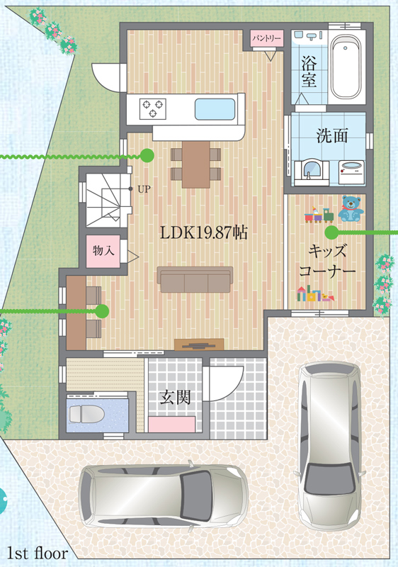 1階はどーんと広い19帖越えのどでかいリビングにキッズスペースがあるのが気になります!