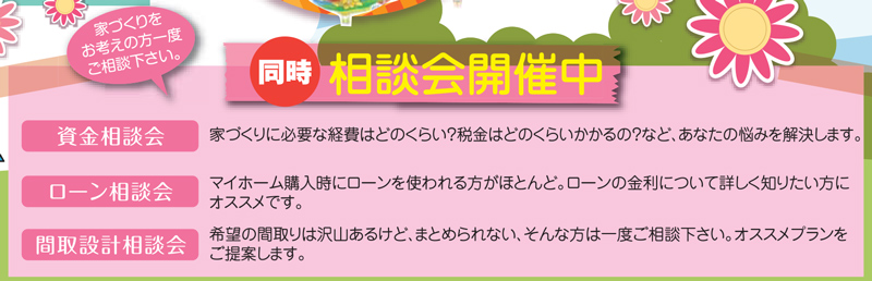 資金やローンそして間取設計など、気になる相談会も開催されます