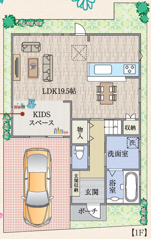 19.5帖の広いLDKと広いキッズスペースが気になりますね!水回りが集まっているので、家事動線がよさそうです。