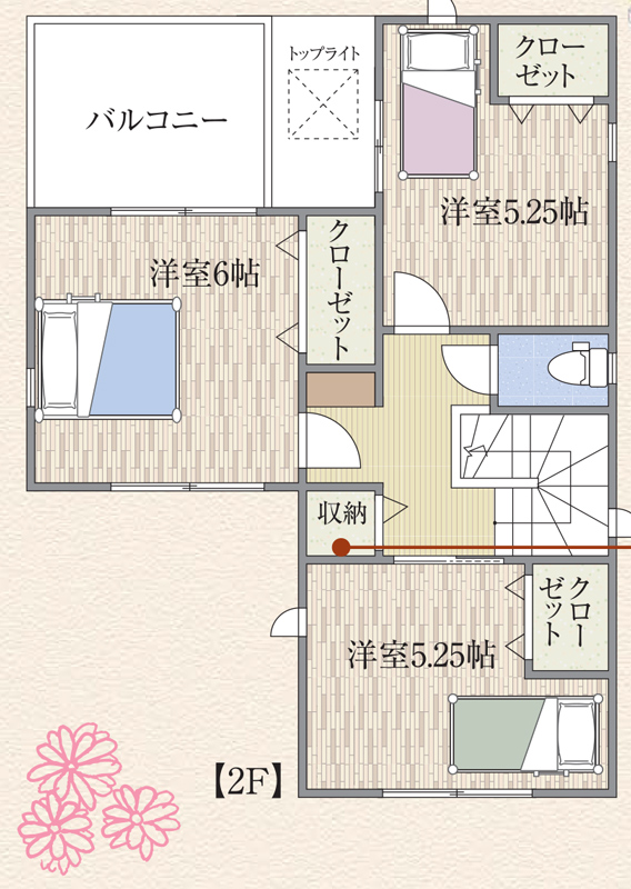 2階はそれぞれ収納スペースつきの5帖以上の部屋が3つあります。バルコニーが広いのも魅力的!!
