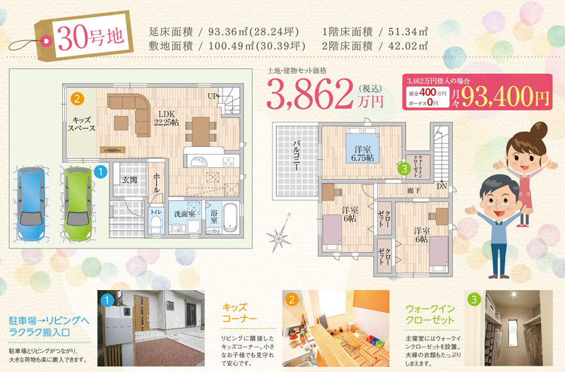 3号地は、20帖越えのひろびろLDKや目の届くところで子どもを遊ばせられるキッズスペースなど子育て世代に嬉しい設計になっています。
