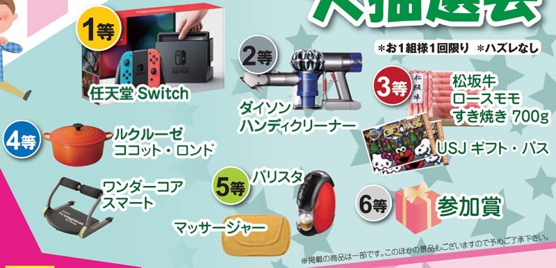 任天堂 Switchをはじめ、ダイソンハンディクリーナーや松坂牛のすき焼き、USJギフト・パスなど豪華な商品をゲットできるかも!?