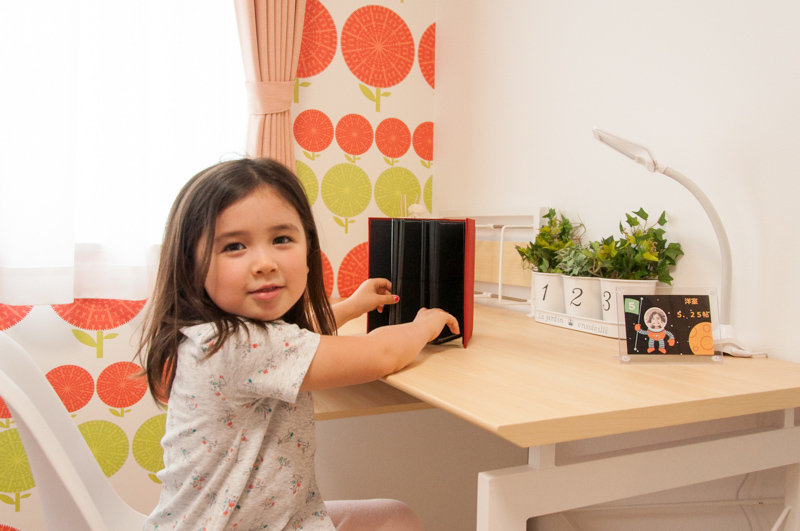 私だって!リビイちゃんもしっかり学習机に座ります。