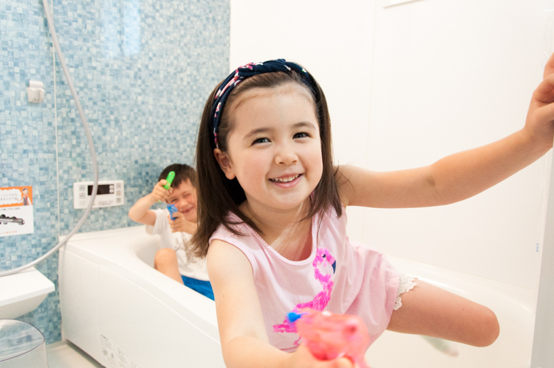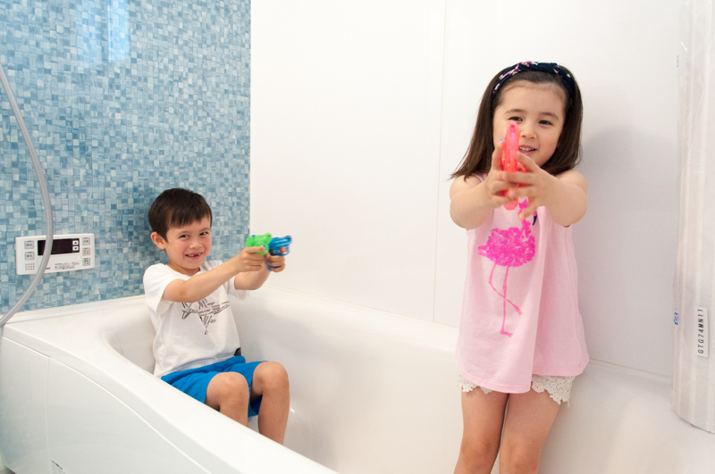 水鉄砲で水遊びしちゃおう!いい笑顔♪広い浴槽は2人で入ってもまだまだ余裕!