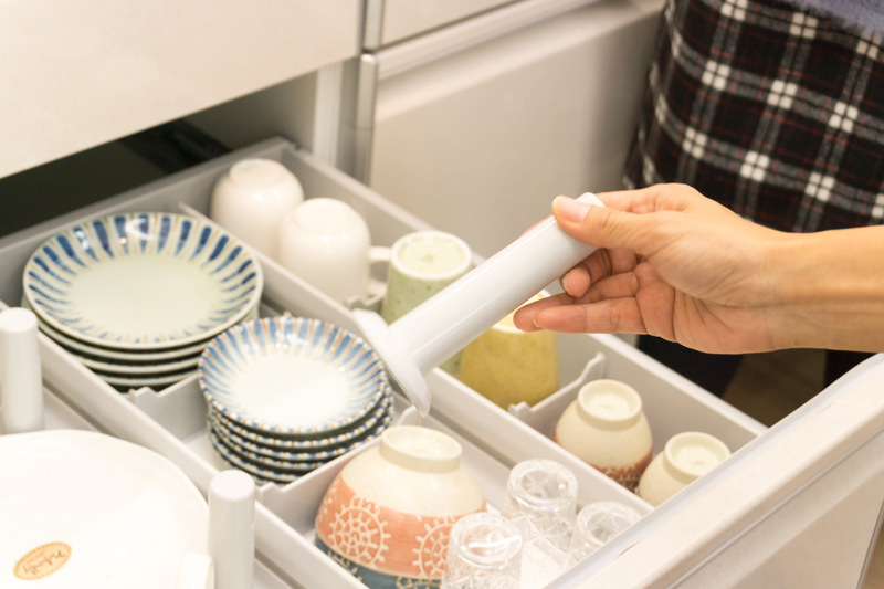 そうすることで、シンク内の食器をすぐに食洗機に収納できるだけでなく、他のスペースを目一杯使った収納を確保できるというわけなんだとか