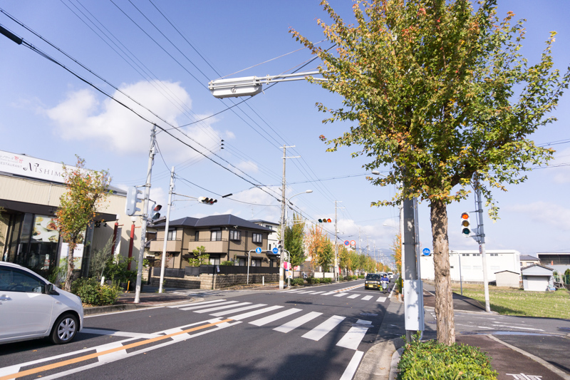 ショールームの前にはレストラン西本があり、右へ行くと牧野・楠葉方面。