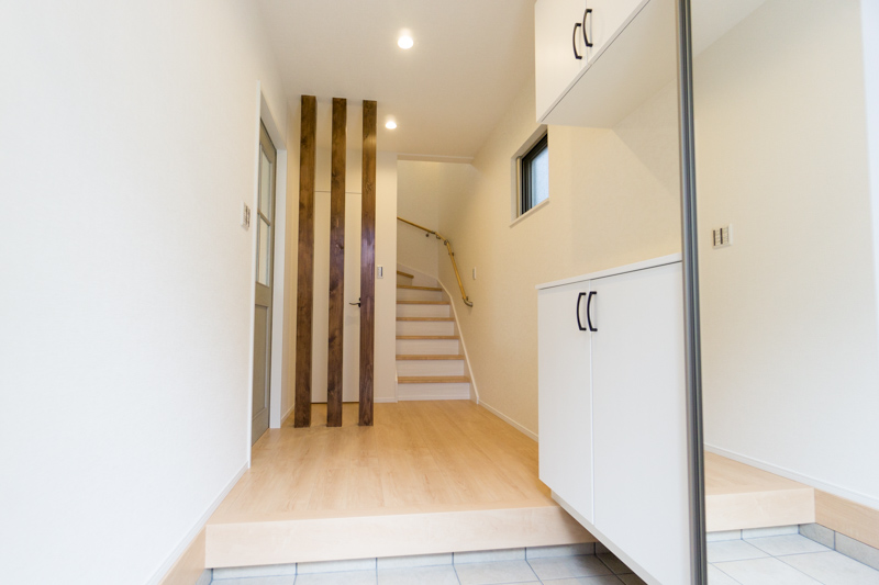 玄関を開けると目に飛び込んでくるのはブラウンの三本柱。落ち着いた玄関のアクセントになっています。