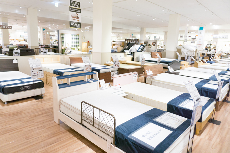 ベッド派の人はぜひ足を運んで欲しいベッド展示コーナー。ご覧の通り圧巻の品揃えなので、きっとお好みの商品が見つかるはず。