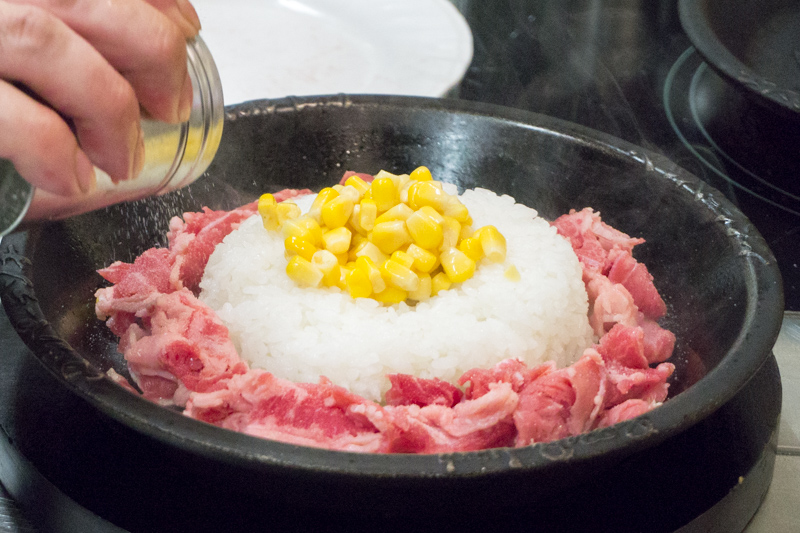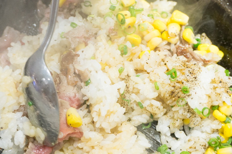 薄切り牛肉とご飯を混ぜてお召し上がり頂く看板メニューです。