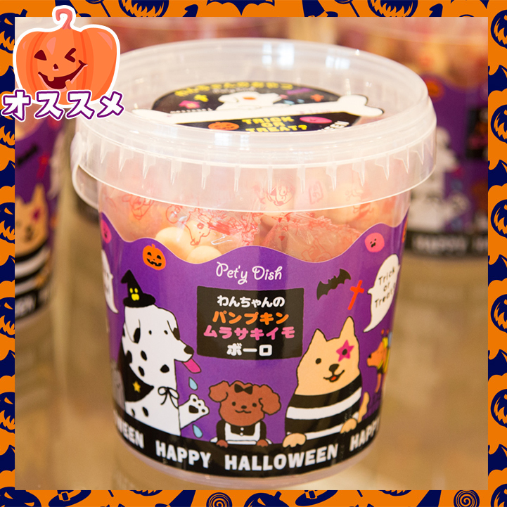 ハロウインパッケージのバケツがとってもキュート!! 人気のパンプキンとムラサキイモのボーロが入っています♪ わんちゃん友達へのプレゼントにもオススメです!