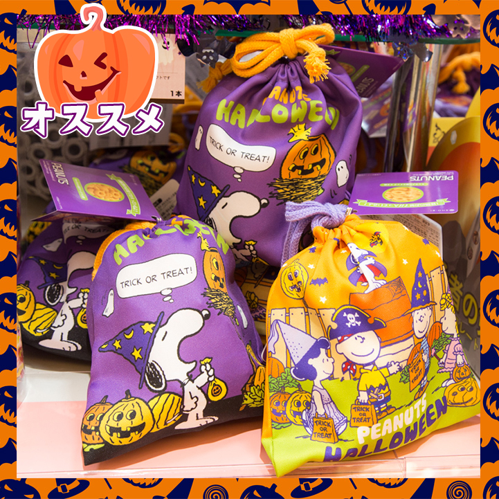 スヌーピーをはじめとしたピーナッツのキャラクターたちのハロウィンデザインの巾着の中にお菓子が入った、この時期ならではのグッズです