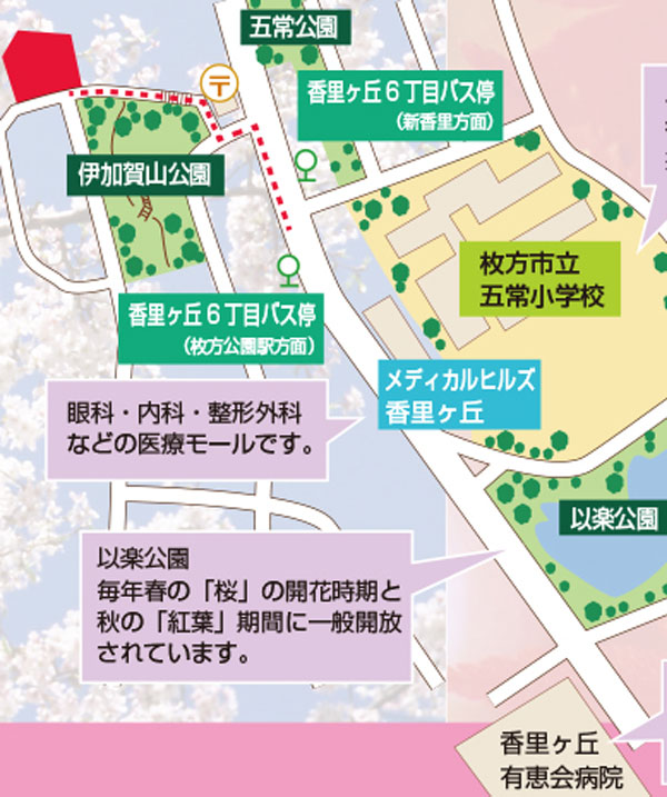 京阪本線「枚方公園」駅からバス6分、香里ヶ丘6丁目から徒歩3分
