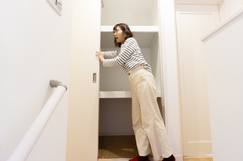 階段を上がっていくと、なんと正面に一畳分ほどの収納スペースが