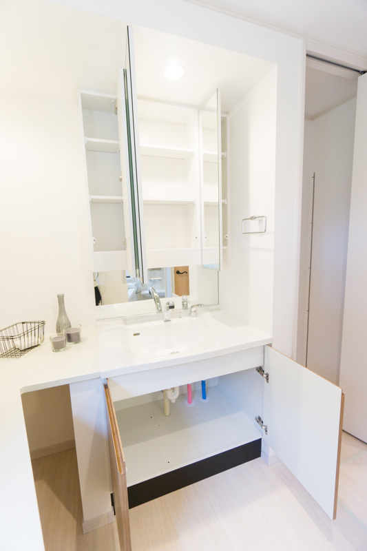 タオルや洗剤など、水回りグッズを丸ごと収納できる大きなリネン庫(写真右)と、洗面台下とサイドにも収納棚があります。