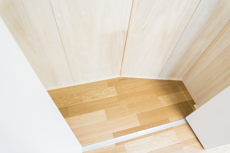 左半分がお昼寝スペースとして使ったり、冬のお布団や大掃除グッズ、レジャー用品など普段は使わないモノを置いておけるスペースで、右半分が階段。