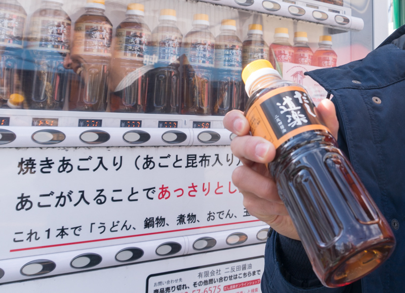 なんと、自動販売機で売られているのは(有)二反田醤油「だし道楽」のお出汁。