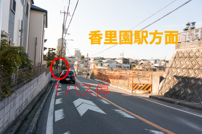 バス通り側(上の図の上側の道)。こっちにいくと香里園駅までほぼ道なりまっすぐで12分。