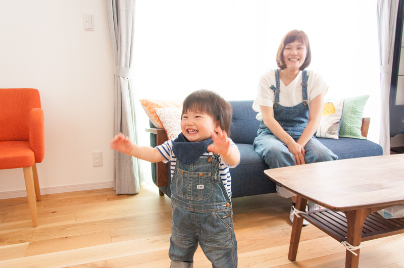 1歳5ヶ月の そういちろう君、気持ちのいい無垢調のフローリングを上手に歩いていました。