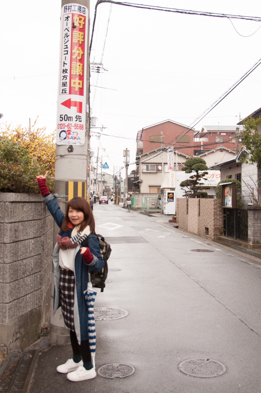 【ウ】方面に行くと国道1号線の高架下に出ます。さらにまっすぐ行くと関西外大がある中宮方面。