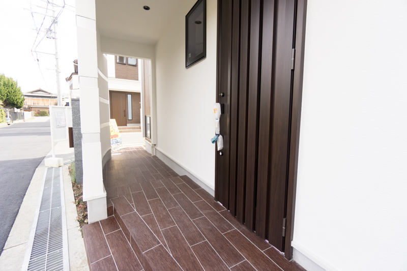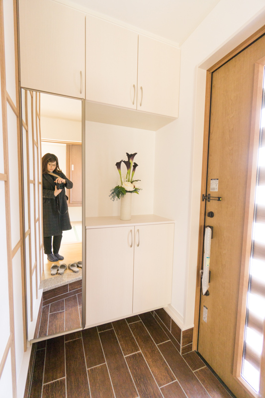 4号地の玄関には姿見があって全身チェックしてからお出かけできます♪もちろん、扉を開けたらシューズクローゼットです!少し見づらいですが左の壁が木の格子になっていてめっちゃオシャレ!!