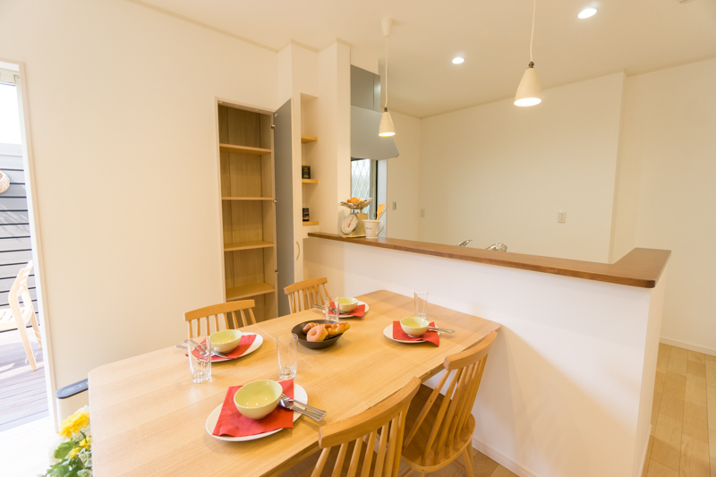 (3)高天井で空間の広がりを出し、採光を取り、明るいダイニングに。