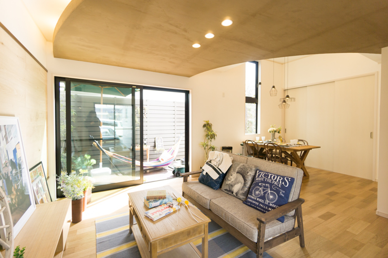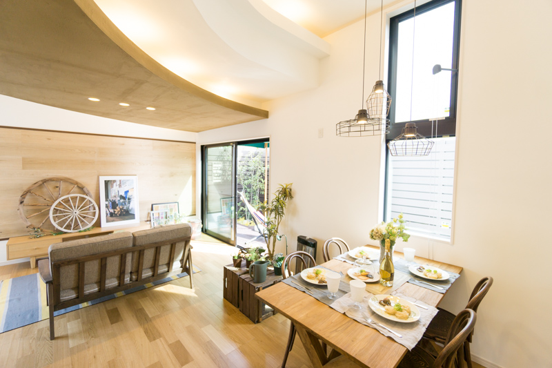 天井が立体的なアール状(曲線)になっていて、優しい雰囲気。そこに間接照明がついていて何ともオシャレ!特にダイニング部分の天井が高くなっており開放感があります。