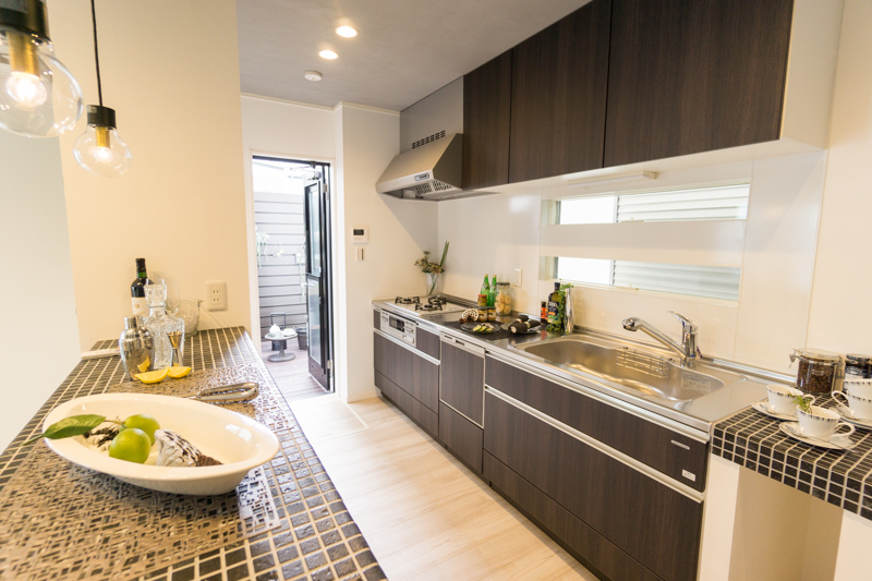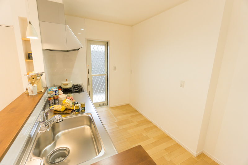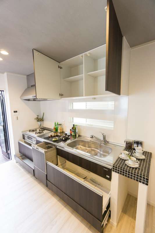 その右隣は広いキッチンです。三口ガスコンロに食洗機、一番下まで入れられる引き出しがあります!