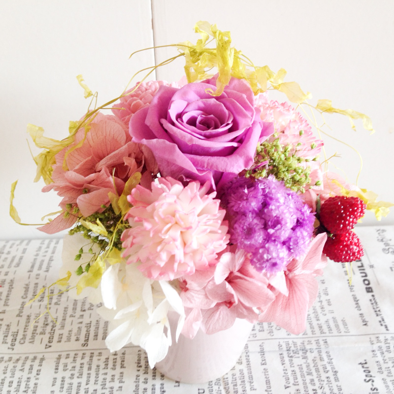 使用するお花は生花ではなくプリザーブドフラワー(一部アートフラワー、ドライフラワー)です。