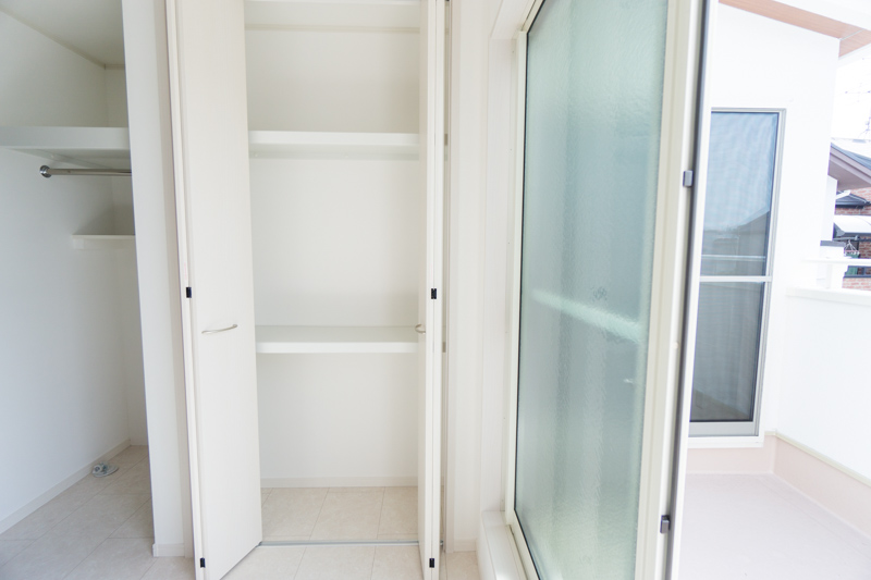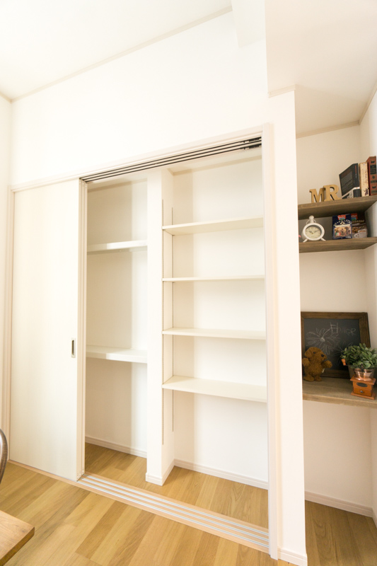 こちらは先ほど奥に見えていた引き戸のクローゼット。高さが変えられるので便利!右のちょっとした飾り棚もオシャレ。