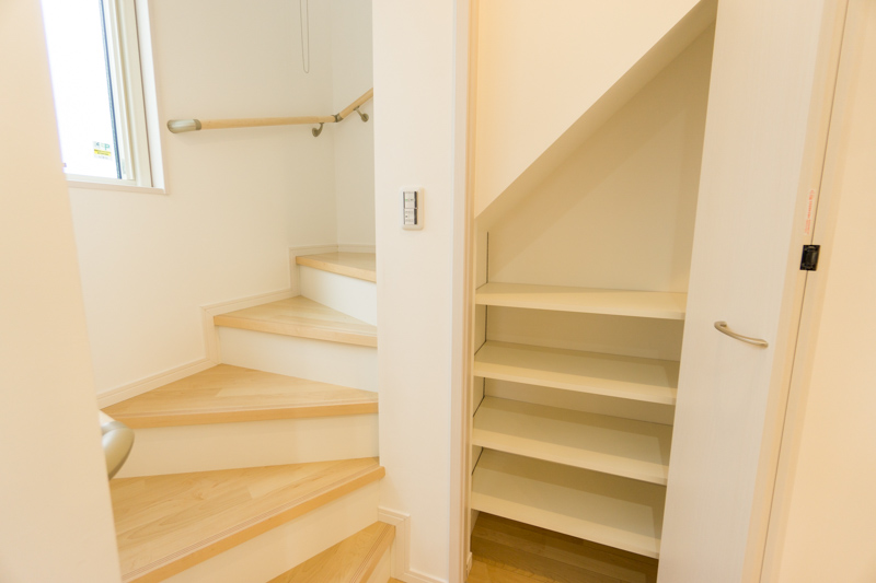 では中に戻って、階段下には高さが変えられる便利収納があります。