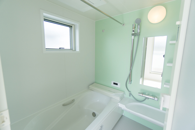 エメラルドグリーンのお風呂もさわやかで清潔感がありますね