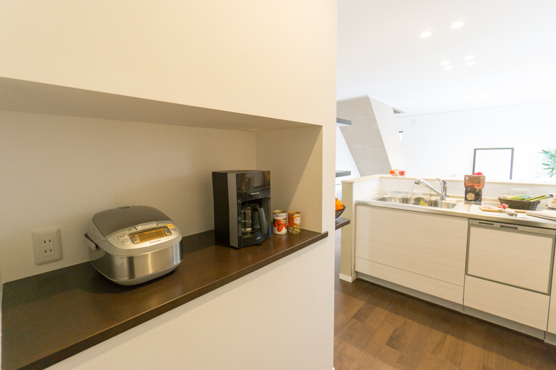 キッチンには少し奥まったスペースがあり、ごちゃっとしがちな冷蔵庫やオーブン・レンジ・食器棚・炊飯器はもちろん、ワインセラーなども置けるくらい広いです!