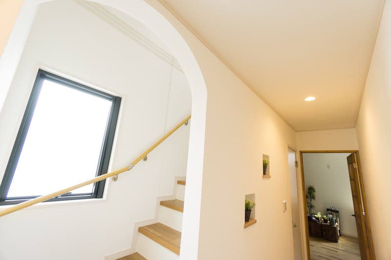 ではかわいいアーチのある階段を上がって2階を見て行きます!