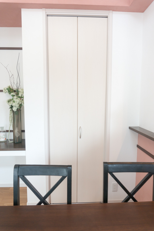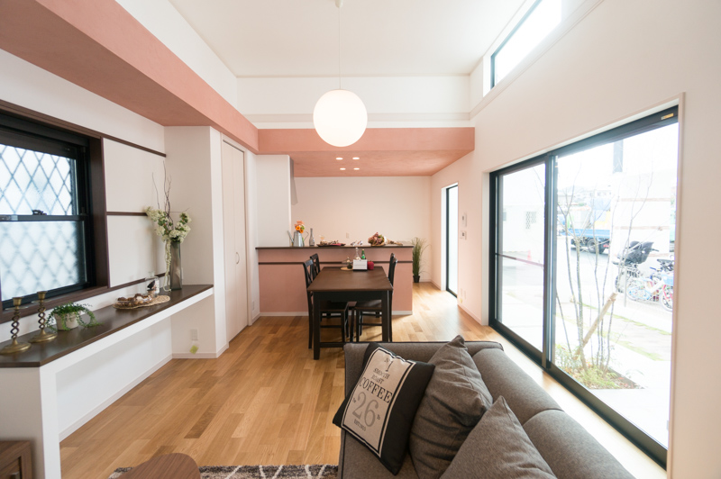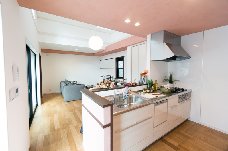 キッチン部分の天井は一面ピンク