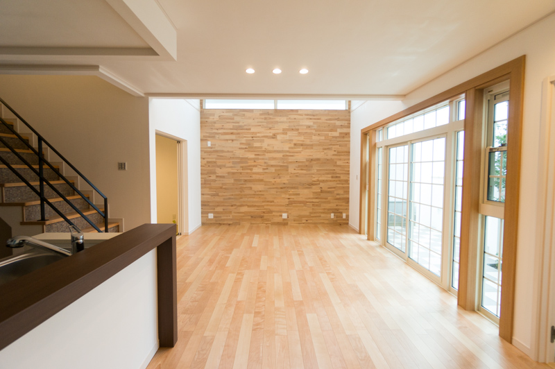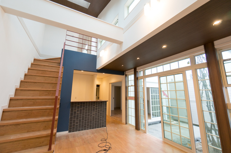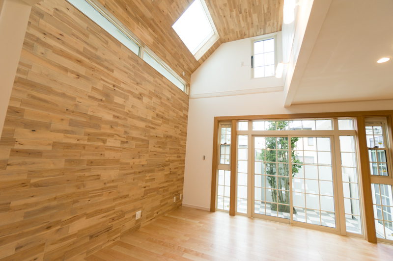 吹き抜けの天井にかけて貼られた、カバの無垢材がダイナミックな印象です!