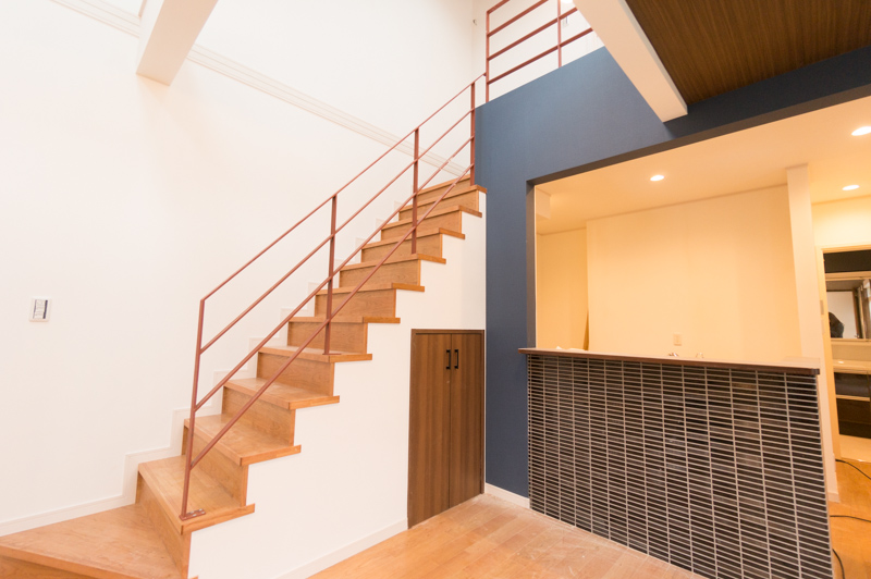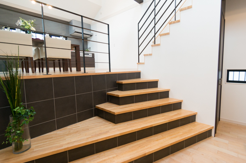階段も注目!!LDKに入ったらパッと目に入るモザイクタイルの階段が印象的。