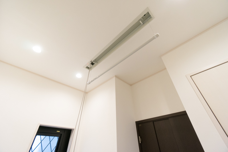 洗面スペースの天井から、洗濯用の物干しざおが降りてくる仕掛け!この物件はバルコニーがないので、洗濯を干すスペースを増やすための工夫でしょうか。心配りがすばらしい