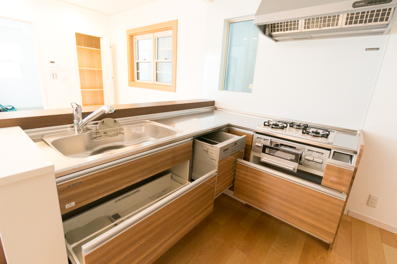 収納力抜群のL字キッチン。ウッディー!