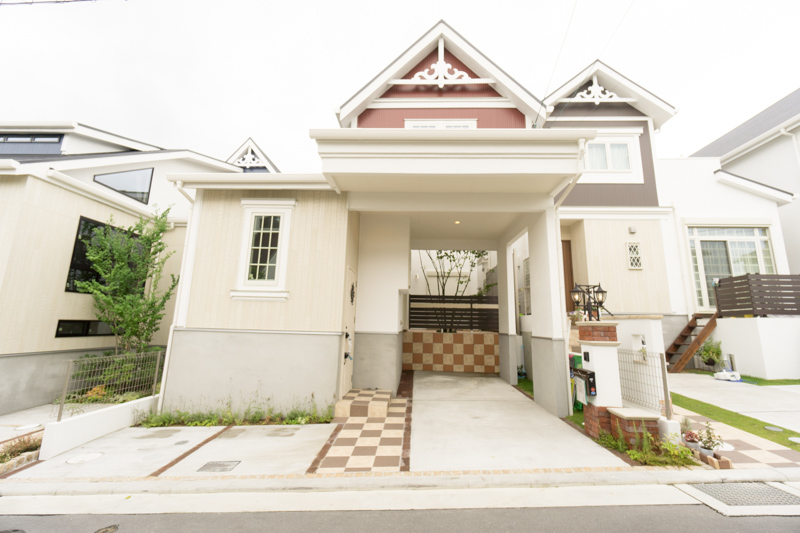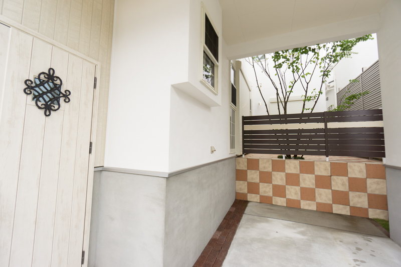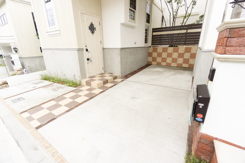 屋根付きなので、雨が降っていても濡れずに家に入れます!左側のお花が植わっているところにも車を1台止められるので、合計2台の駐車スペースがあります。