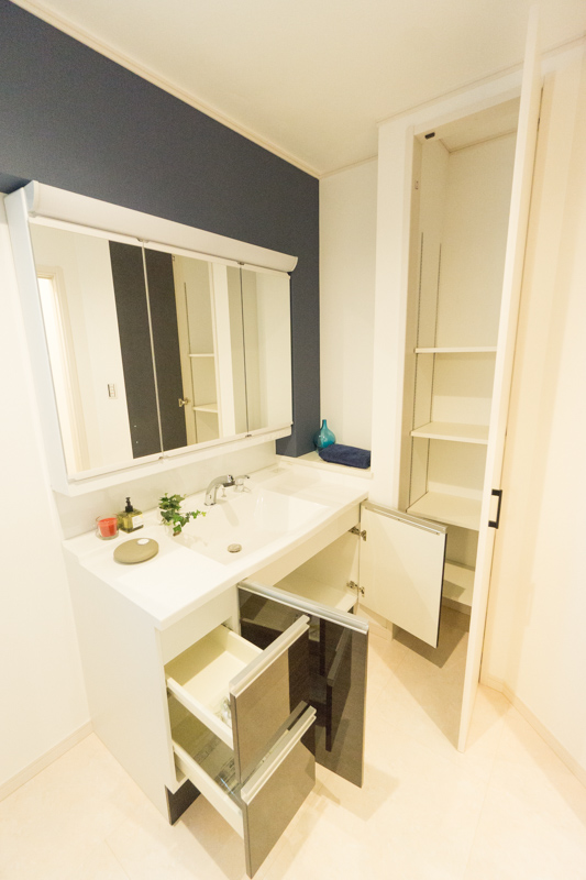 かさばるタオルや洗剤等をまとめて収納できる大きいリネン庫が嬉しい!高さがかえられるのも嬉しい。