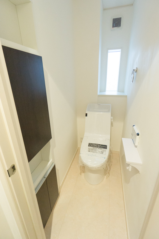 トイレの中にも便利な収納棚がついています。窓があって明るい