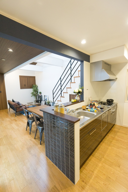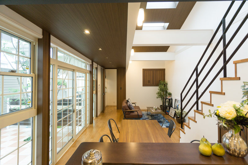 そして、敷地の高低差を活かした階段があり、リビングへとつながっています。